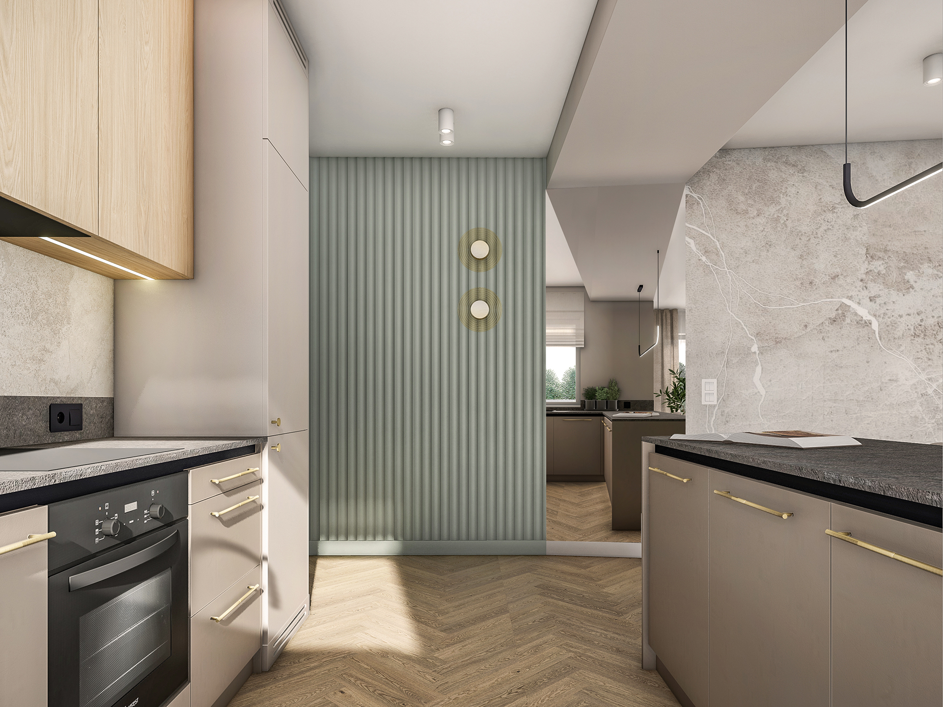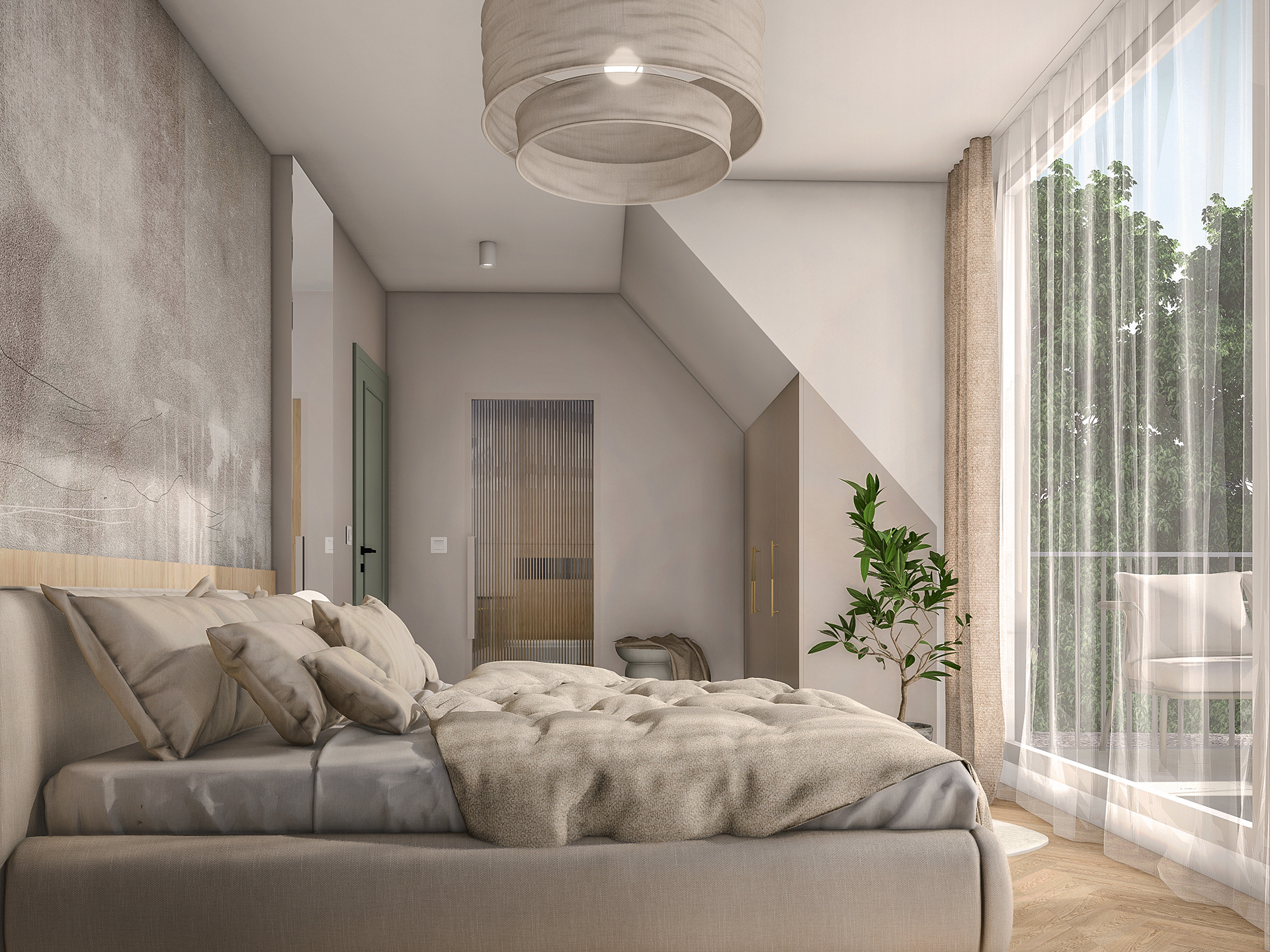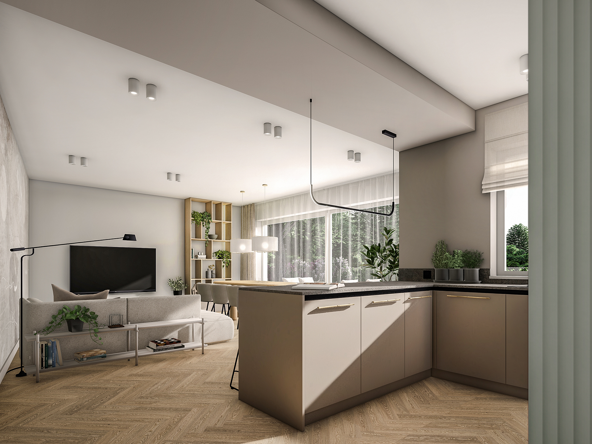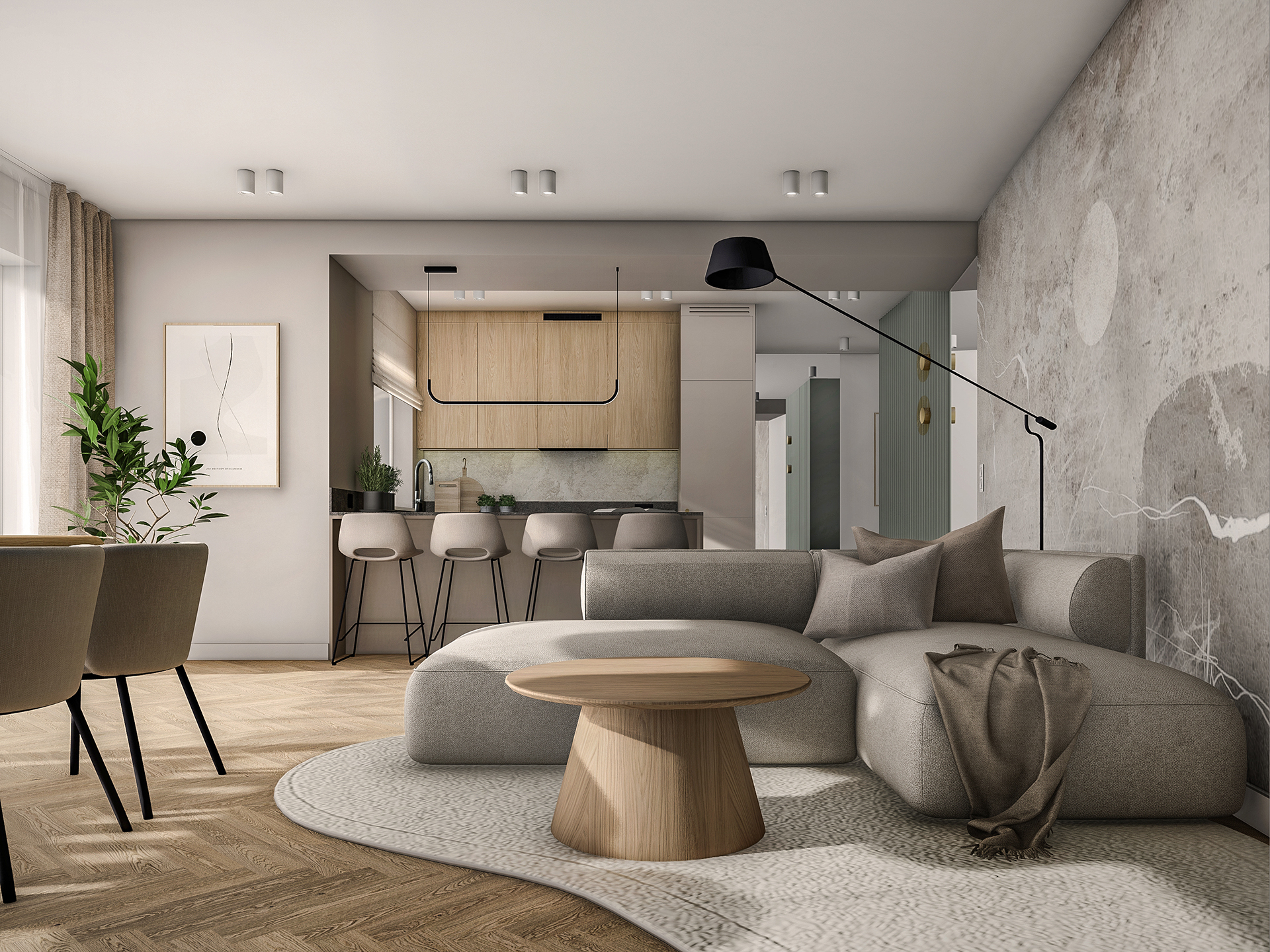 Projektowane wnętrza mają dawać mieszkańcom poczucie komfortu i ciepła korzystając ze stonowanej palety kolorystycznej (kolory ziemi). Naturalne drewno, odcienie beżu i akcenty zieleni – mają dobrze współgrać z architekturą i zewnętrznym wyrazem obiektu.