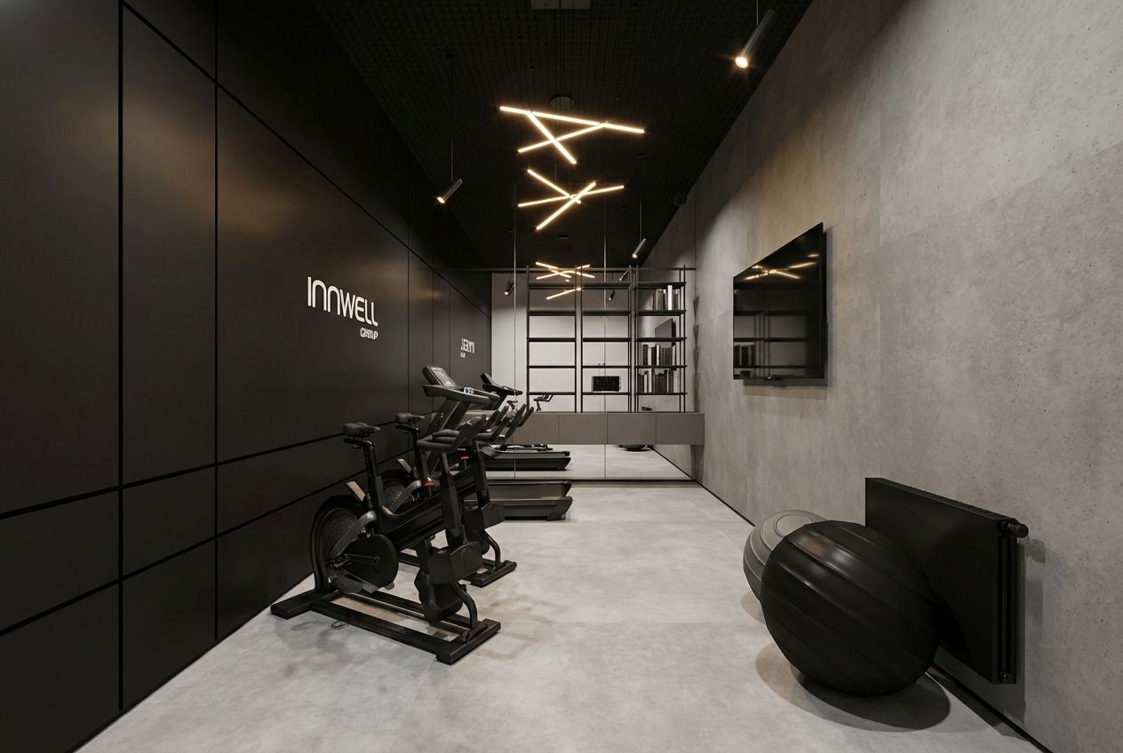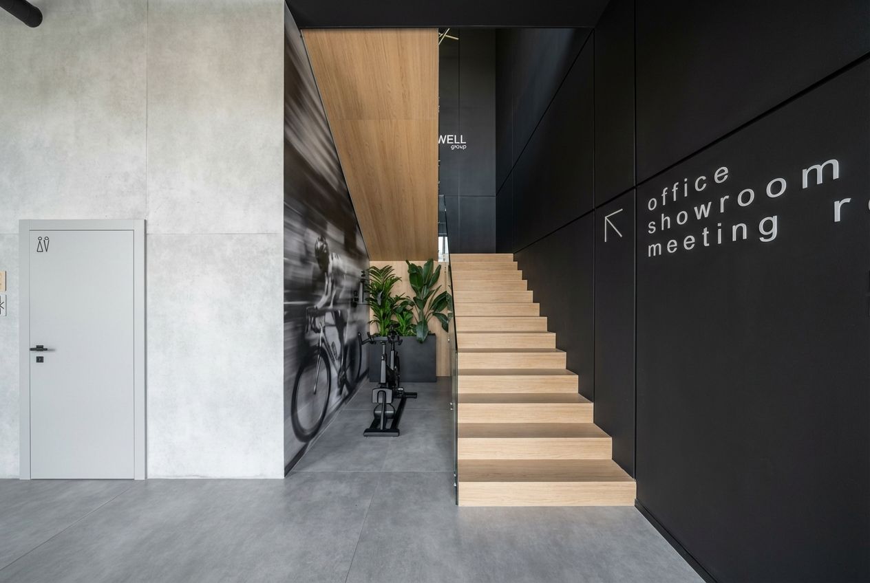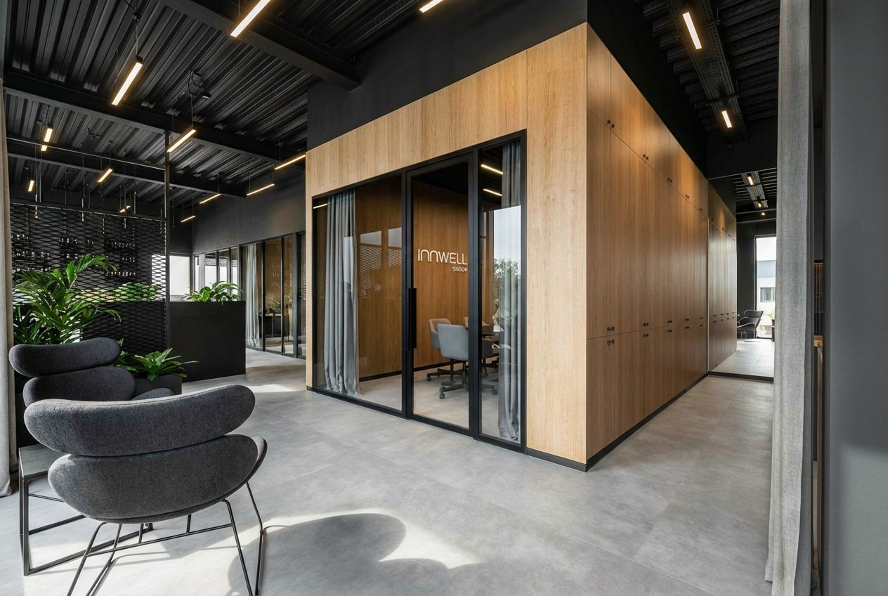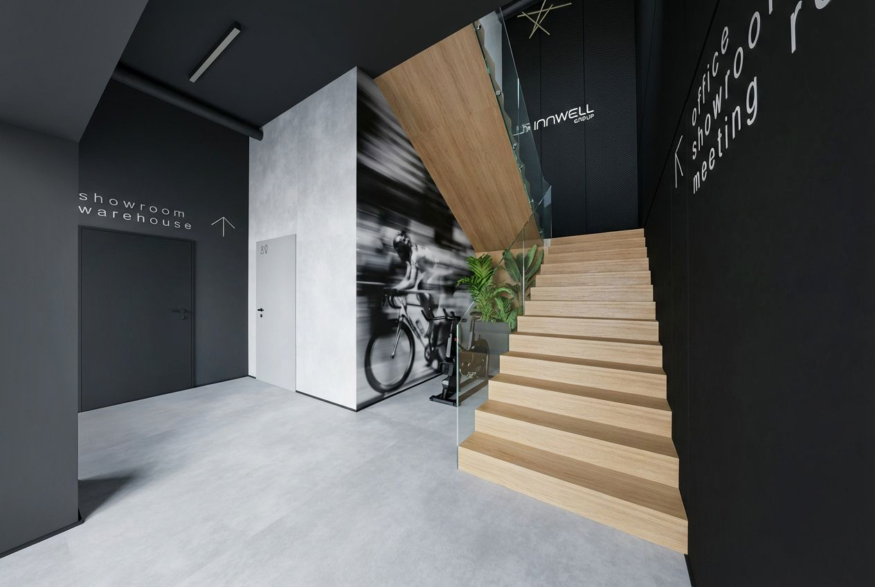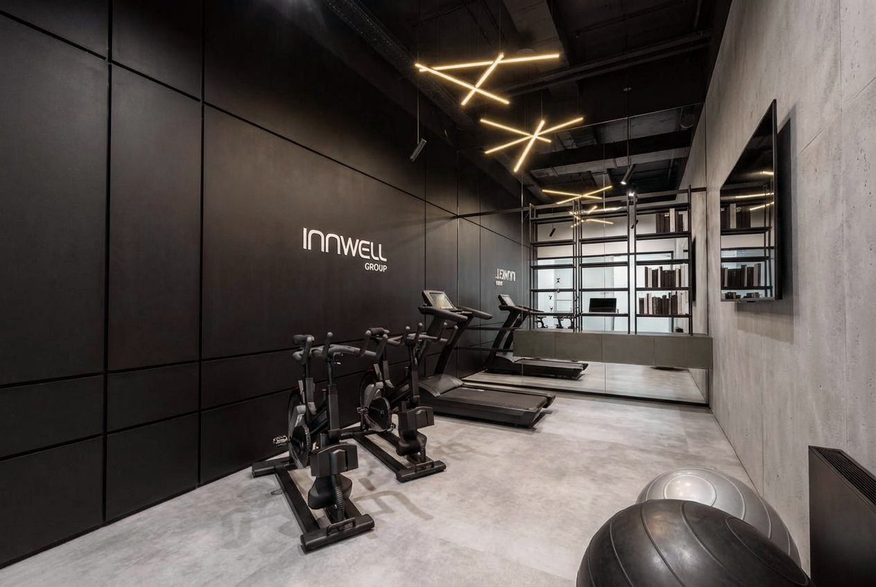 Firma Innwell zajmuje się dystrybucją i produkcją sprzętu fitness (m.in. EMS, Pilates), akcesoriów treningowych oraz rozwiązań dla klubów sportowych i studiów treningowych. Blisko 180 m² funkcjonalnego biura zapewnia komfortowe warunki pracy dla całego zespołu — gabinety zarządu, strefę open space, salę konferencyjną, dwa showroomy oraz zaplecze socjalno-techniczne.