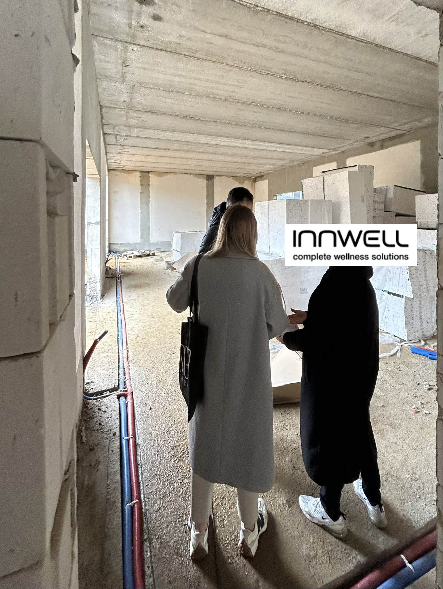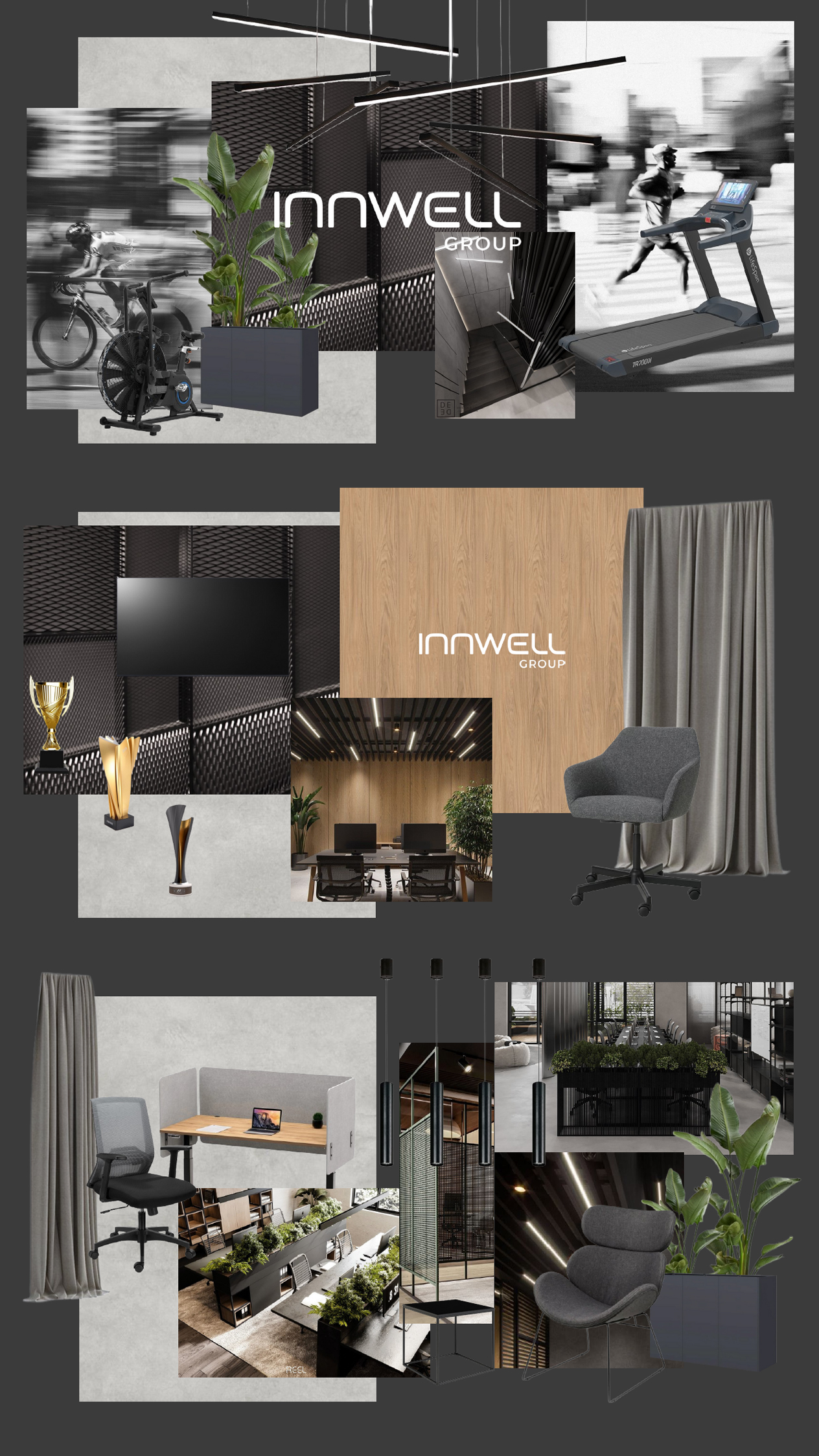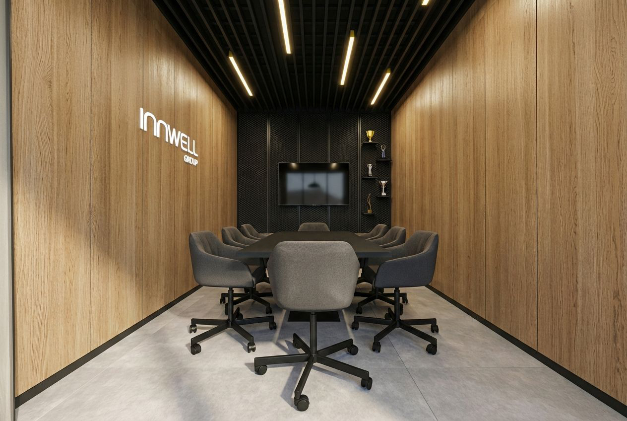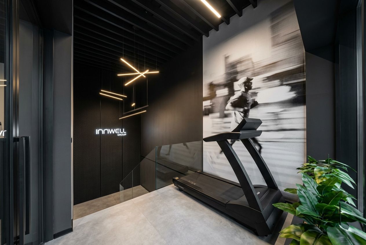 Firma Innwell zajmuje się dystrybucją i produkcją sprzętu fitness (m.in. EMS, Pilates), akcesoriów treningowych oraz rozwiązań dla klubów sportowych i studiów treningowych. Blisko 180 m² funkcjonalnego biura zapewnia komfortowe warunki pracy dla całego zespołu — gabinety zarządu, strefę open space, salę konferencyjną, dwa showroomy oraz zaplecze socjalno-techniczne.