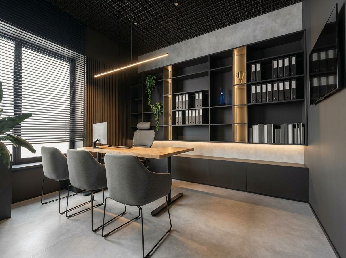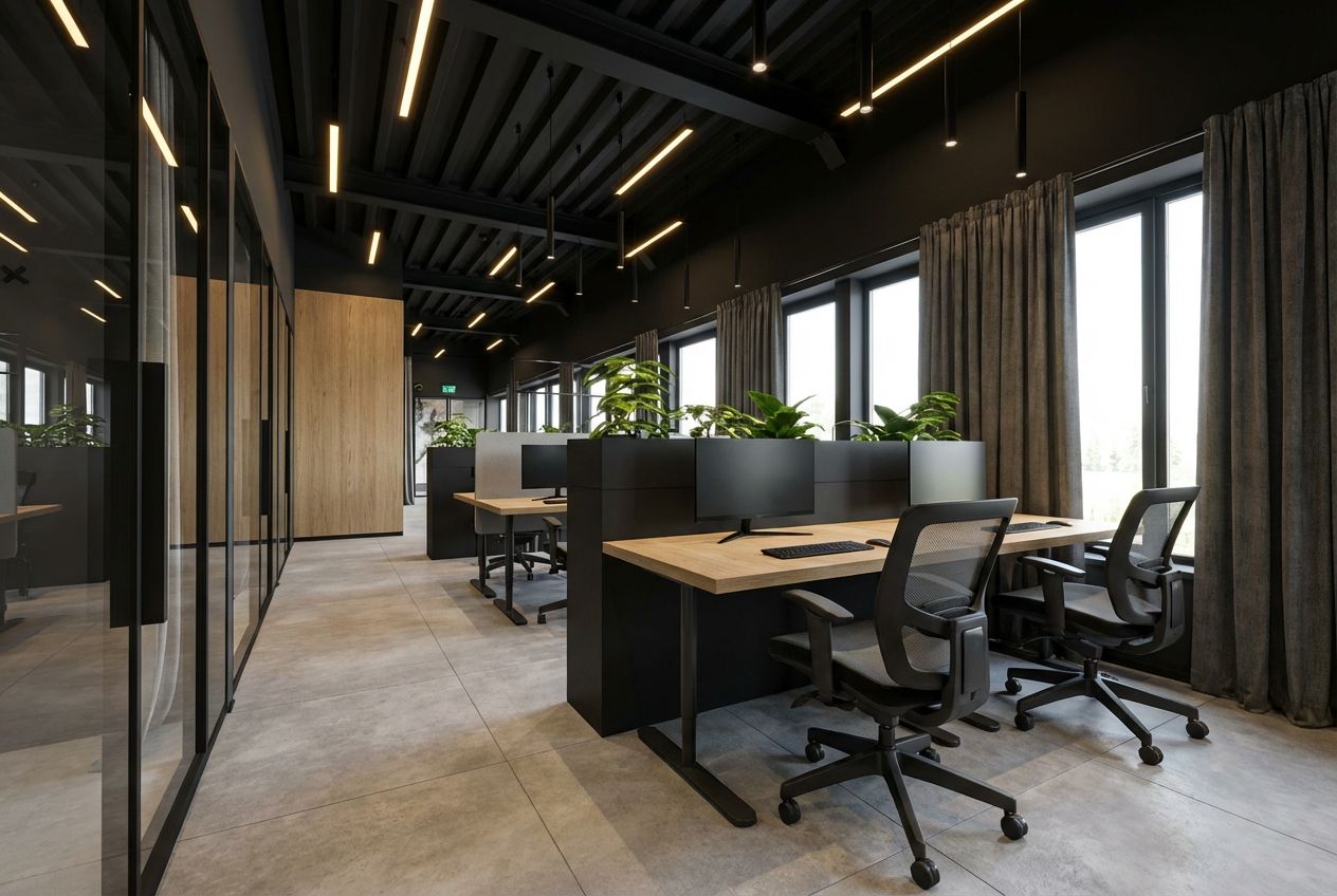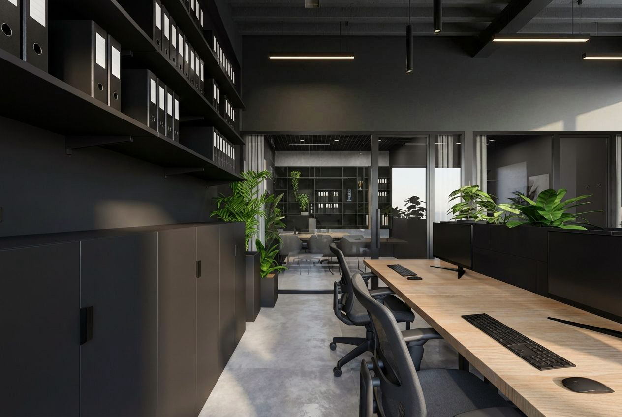 Całość utrzymana jest w ciemnej, eleganckiej estetyce. W projekcie dominują ciepłe drewno, surowy beton oraz czarne dodatki, które wspólnie tworzą nowoczesną i prestiżową przestrzeń do pracy. Efekt? Styl, funkcjonalność i charakter w jednym miejscu.